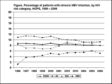 The investigators concluded that "The prevalence of chronic HBV infection in the HOPS [cohort] was unchanged over the past decade among patients in all demographic and HIV risk groups," although the overall prevalence was "20 times greater than national prevalence estimates" for the general HIV negative population (0.42%).
